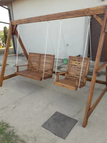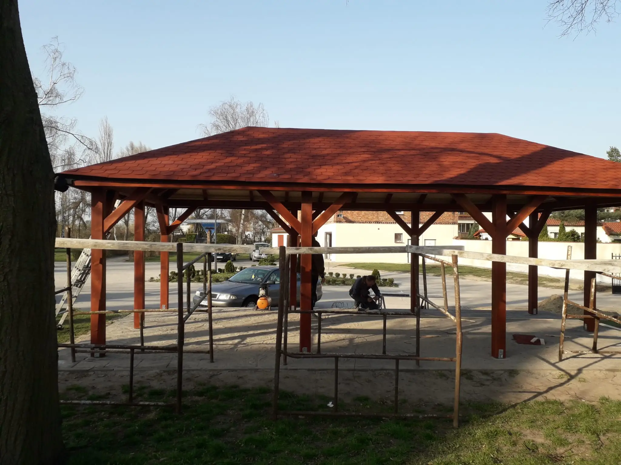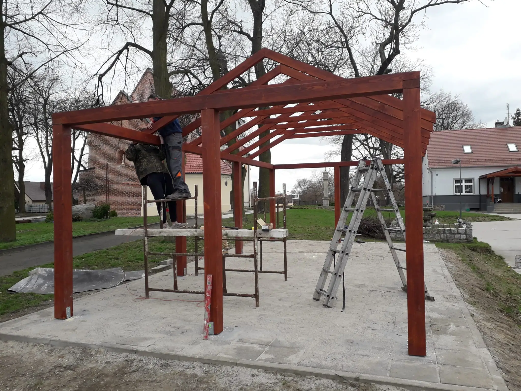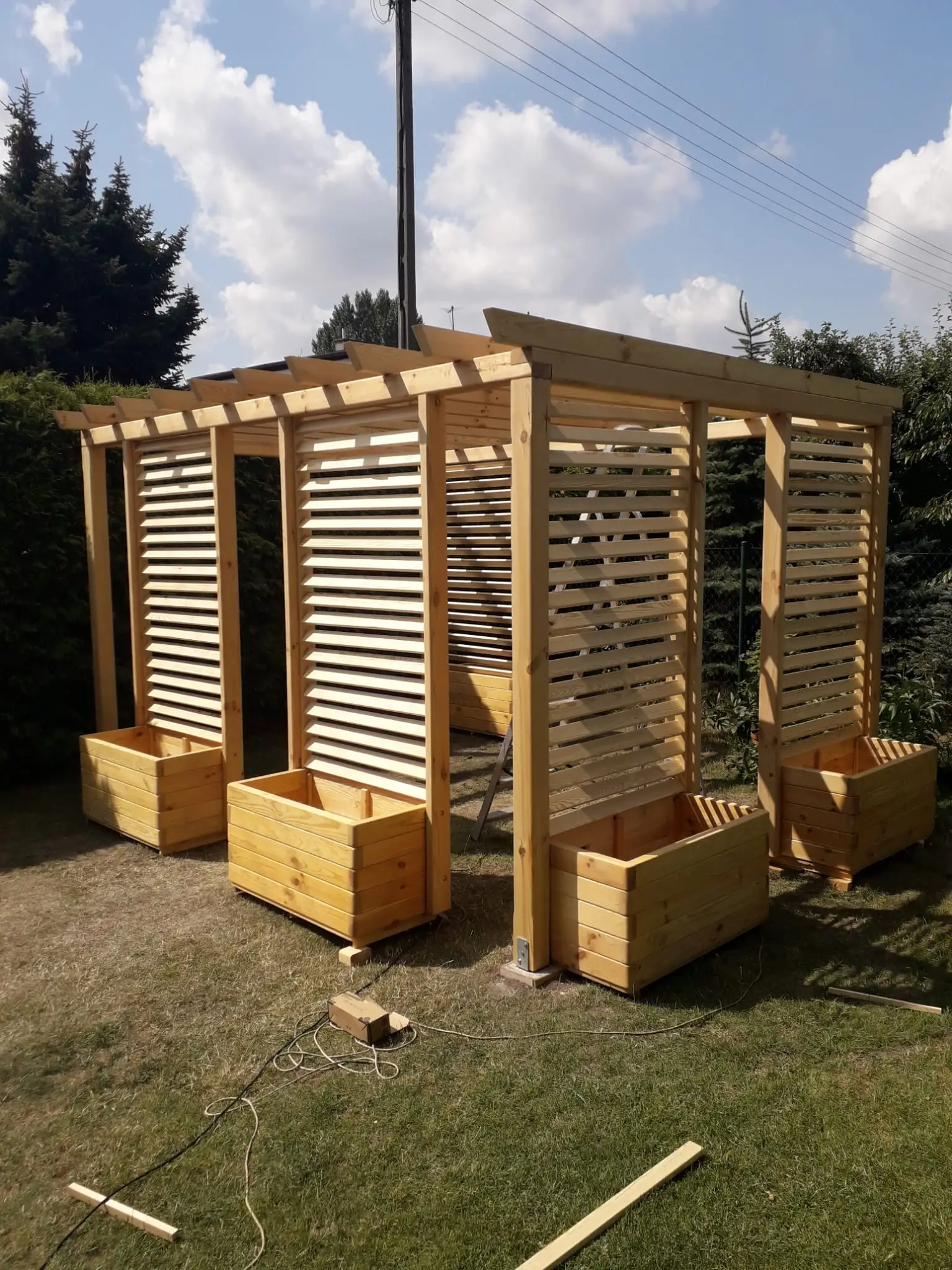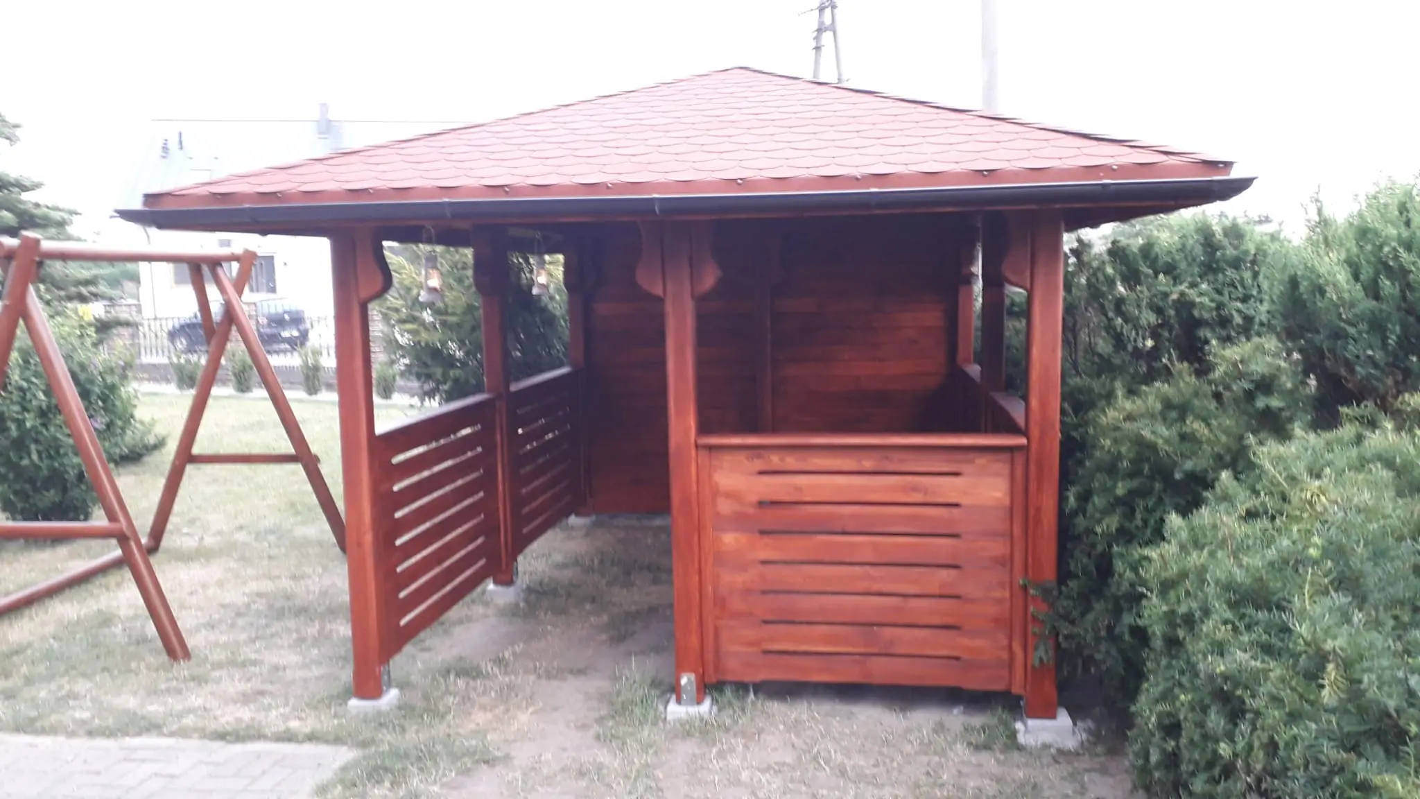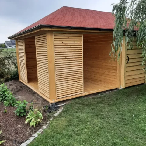 - Altany i pergole – konstrukcje dopasowane do ogrodu klienta, wykonane z litego drewna, z dachami pokrytymi gontem bitumicznym lub klimatycznym poliwęglanem
